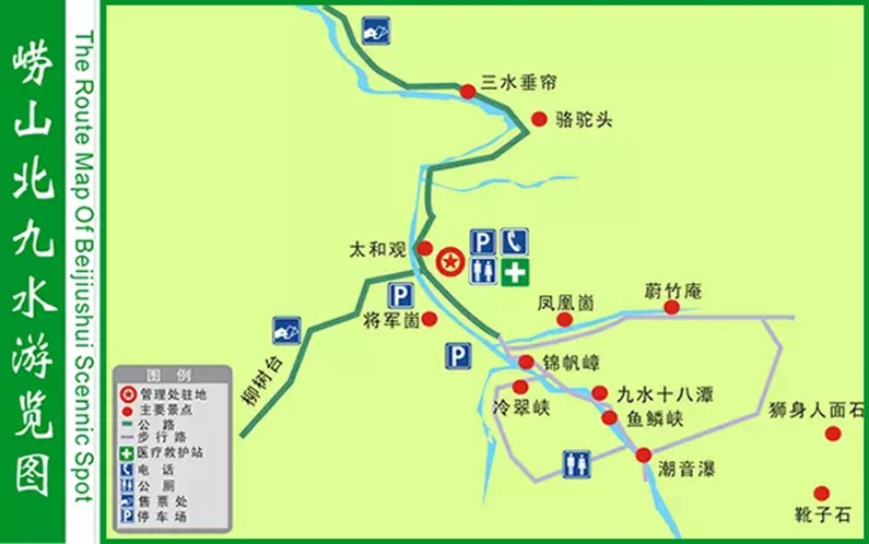 北九水位于青島嶗山白沙河上游。白沙河源出山頂北麓,河水經(jīng)山腳而折流,有九折;人行河畔小路,轉折處須涉水而過,亦九涉;每涉一次為一水,故稱九水。九水又分內(nèi)九水、外九水(即北九水)和南九水三路,其中以北九水的景觀最為著名。
